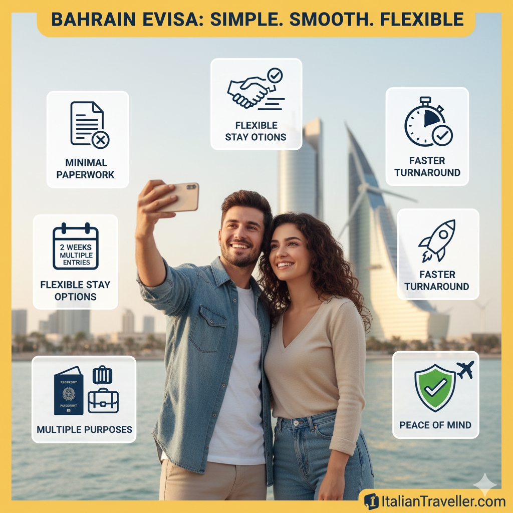 If you’re coming from Italy or elsewhere in Europe, the Bahrain eVisa brings several benefits that make your travel simpler, smoother, and more flexible: